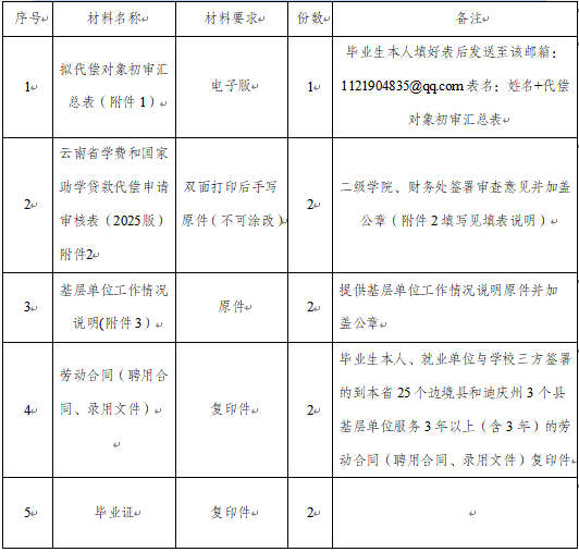 为认真贯彻执行《云南省教育厅办公室关于做好2025年云南省普通高校毕业生学费和国家助学贷款代偿初审工作的通知》精神,积极引导和大力鼓励学校毕业生赴基层单位就业,进一步加大对25个边境县市和迪庆州3个市县基层单位就业的人才扶持力度,现就学校2025年毕业生学费和国家助学贷款代偿初审相关工作事宜通知如下: