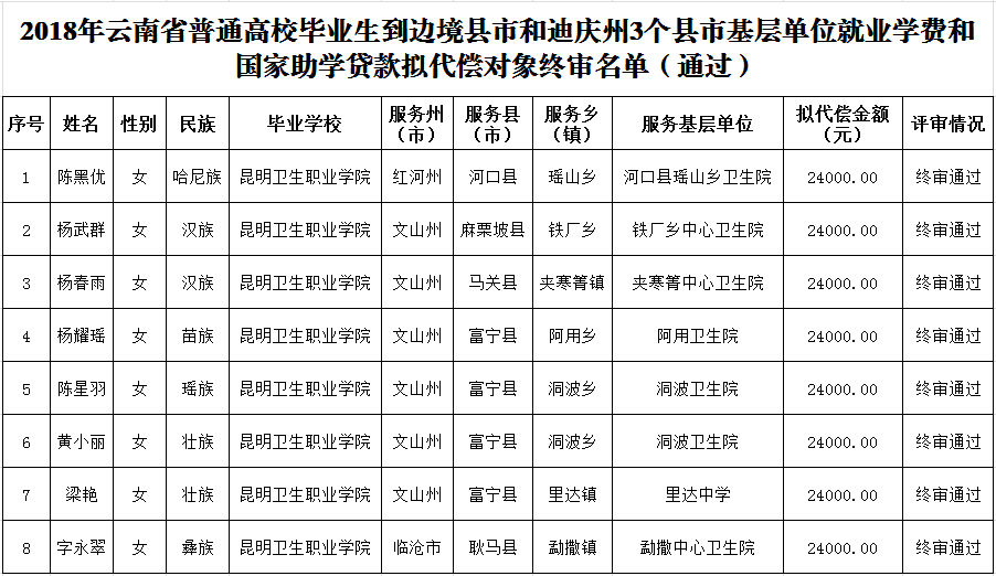 经审核并公示无异议,对《云南省教育厅关于公布2018年云南省普通高校毕业生到边境县市和迪庆州3个县市基层单位就业学费和国家助学贷款代偿终审结果的通知》中sunbet申搏8名通过终审毕业生予以公布。