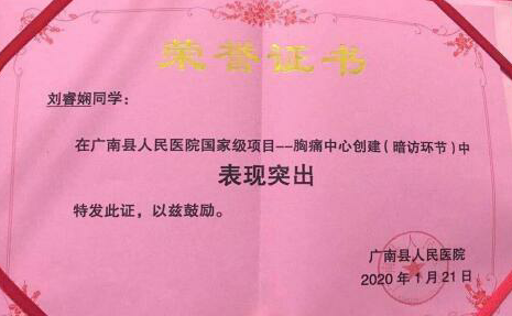 sunbet申搏2015级五年制护理4班学生刘睿娴,在广南县人民医院实习期间,积极参与科室的胸痛业务培训,在医院胸痛中心接受专家组暗访期间,为医院胸痛中心暗访环节赢得了专家较高的评价。为此,经医院办公会研究决定,对sunbet申搏刘睿娴同学特别予以全院通报表扬。2019年11月11日——2019年12月...