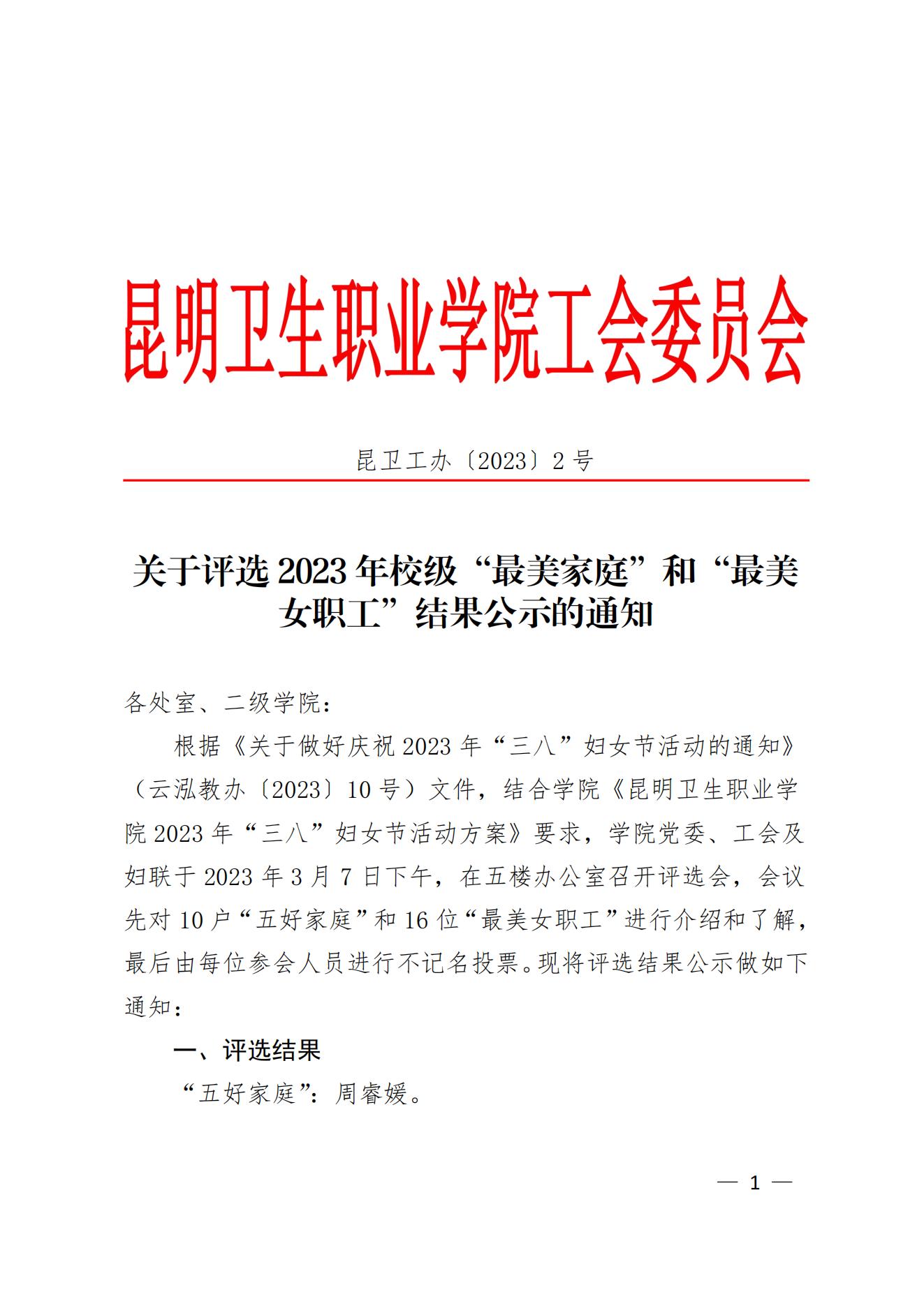 关于评选2023年校级“最美家庭”和“最美女职工”结果公示的通知
