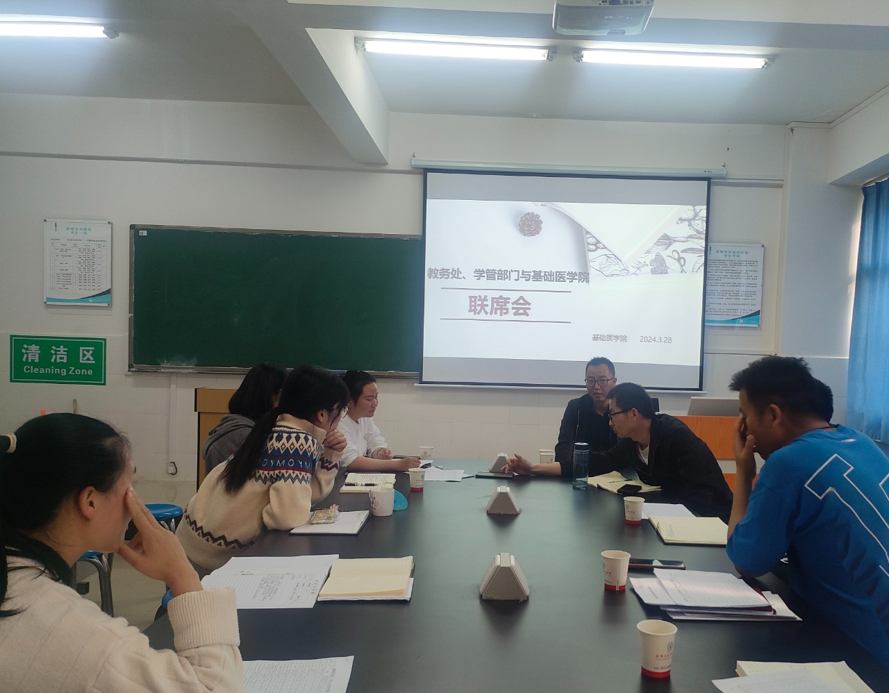 为贯彻落实学校“真教、真学、真督”理念,2024年3月28日下午,基础医学院与教务处、大学生工作部和其他二级学院学管部门组织召开联席会,针对学生转变学习态度,优化学习意识,创新学科学习思维等问题进行讨论,并采取相关措施,高站位、高效率、高标准地提升学生学习素养与质量。
