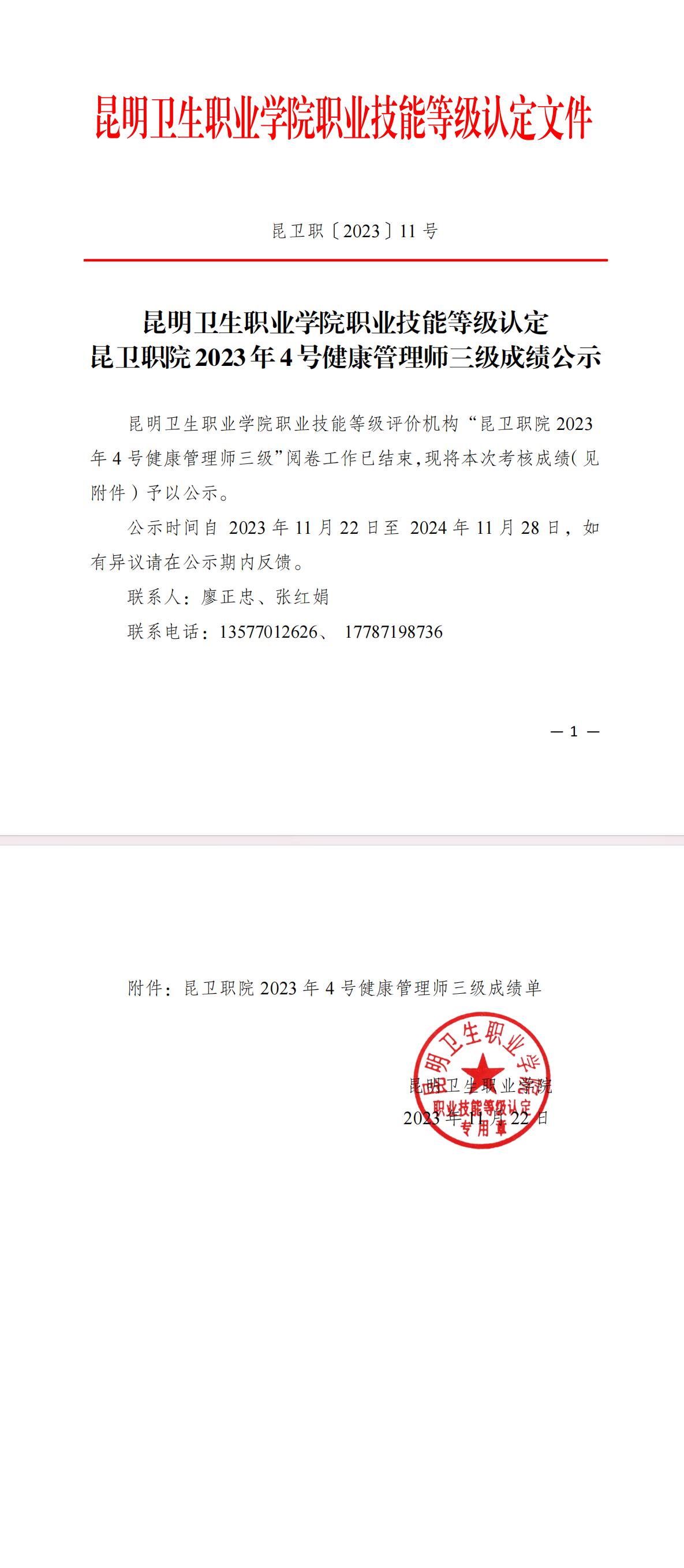 附件昆卫职院2023年4号健康管理师三级成绩单.pdf