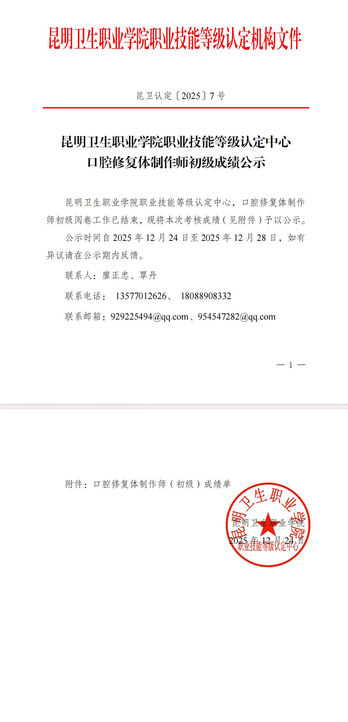 昆卫认定2025-7号文件-口腔修复体制作师初级成绩公示