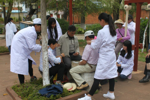 (图一:活动现场医疗部的部长在给老人们测血压)