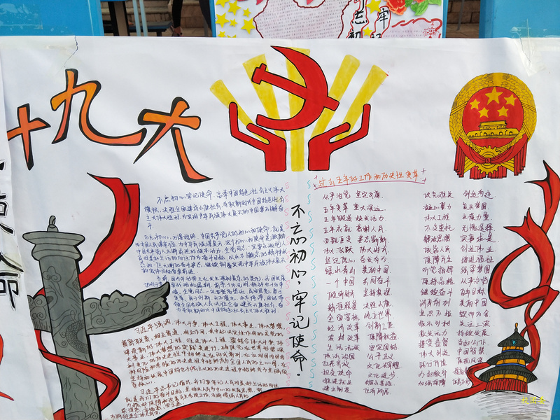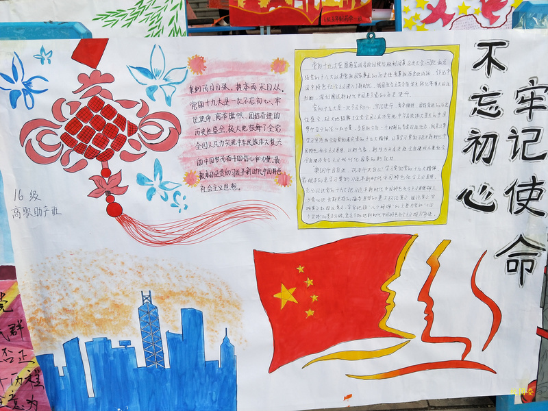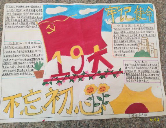 本次活动充分的让同学学习及认识到党的十九大的重大意义及知识本次手抄报活动让大家对本次十九大精神会议有了深刻的了解,各色各样的手抄报引起了广大师生的关注,纷纷前来观看。不忘初心、继续前进,才能开辟未来、走向辉煌,才能书写无愧于历史、无愧于人民、无愧于时代的业绩。让我们紧密地团结在党的周围,勇于变革、勇于创新,永不僵化、永不停滞,为实现“两个一百年”奋斗目标、为实现中华民族伟大复兴的中国梦继续前进!