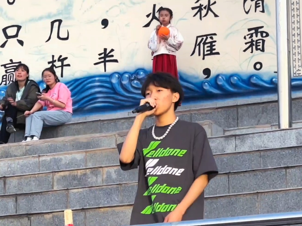 在现场工作人员的组织下,学生们自发的摇摆起来,音响里吼出的激昂劲爆的摇滚乐曲彻底点燃了青年学子的激情,现场的气氛瞬间达到了高潮,主持人拿着话筒铿锵有力的喊着“One,Two,Three,let’s go!”声音越来越大,热情迅速感染着操场附近的同学,越来越多驻足观看的同学选择加入到队伍中去。