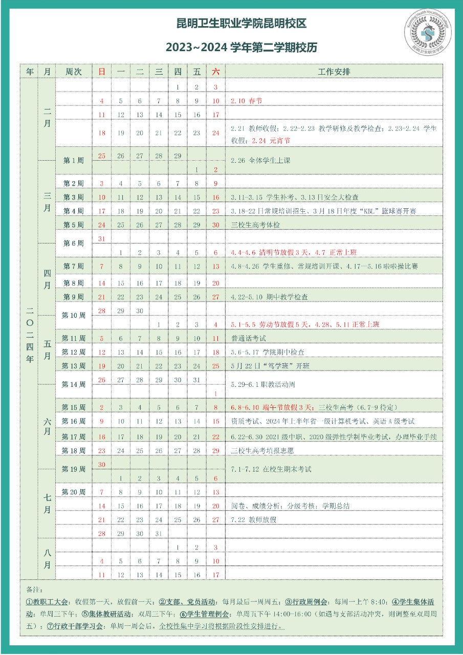 sunbet申搏官方网站昆明校区2023~2024学年第二学期校历