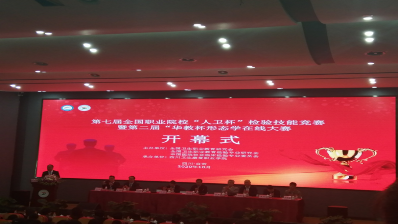 2020年10月17日,由全国职业教育教学指导委员会医学检验技术分委会、中国医院协会临床检验专业委员会主办,四川康复职业学院、人民卫生出版社和重庆华教科技有限公司承办的第七届全国职业院校"人卫杯"检验技能竞赛暨第二届"华教杯"形态学在线大赛在四川省自贡市四川康复职业学院拉开帷幕,来自全国各地中职组13支,高职组37支,本科组2支共52支代表队参赛,大赛设中职组、高职组和本科组。在为期三天的竞赛中,中职组选手们将以手工法操作形式,对细菌检验(革兰染色法及细菌鉴定思路)、白细胞计数及临床运用、总蛋白测定及临床运用进行抽签比赛,形态学检验在线竞赛作为必赛项目。
