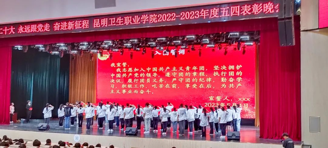 颁奖典礼结束后,进行了庄严的新团员入团宣誓仪式。面对鲜艳的团旗,在领誓人的带领下,全体新老团员举起右拳,郑重地许下新时代青年团员的铮铮誓言。