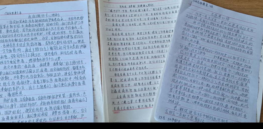 通过主题班会,各班同学们写下了本次主题班会的心得感悟,还分享了自己在当疫情防控志愿者时的见闻。所有同学通过本次主题班会的召开,了解了党和国家的疫情防控政策,掌握了科学的防疫知识与方法,正确面对当前疫情防控的严峻形势。深入理解了“防疫与自身健康”“防疫与家庭幸福”“防疫与国家安宁”之间的密切关系,深入理解了“生命重于泰山,疫情就是命令,防控就是责任”的深刻含义。